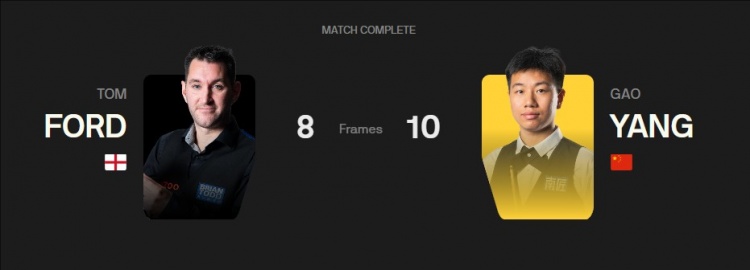 第一阶段过后汤姆·福德6-3领先高阳,第二阶段高阳连胜反超比分,最终10-8逆转战胜对手晋级。