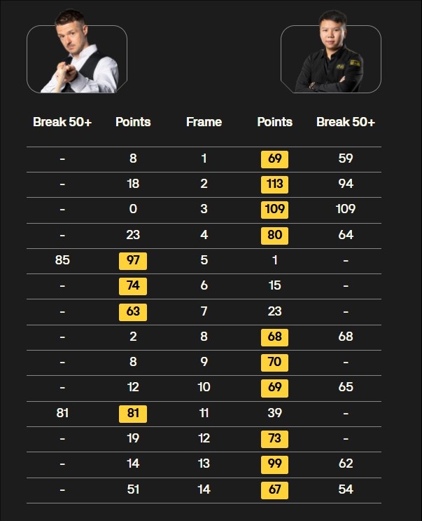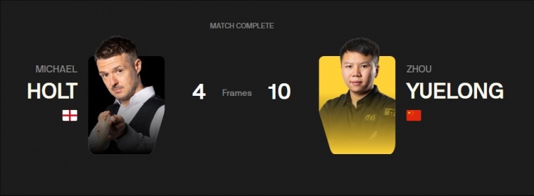 第一阶段战罢周跃龙6-3暂时领先霍尔特,第二阶段周跃龙率先到达赛点,最终10-4战胜对手晋级正赛。