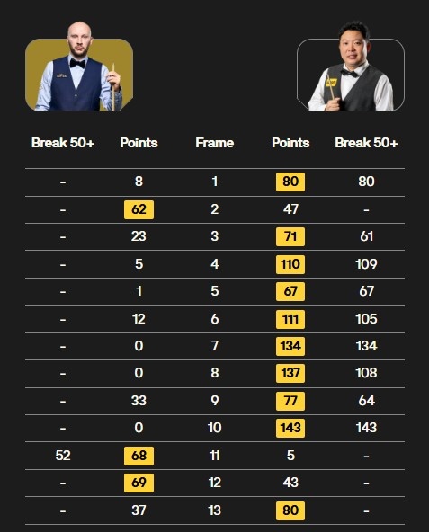 全场比赛,张安达进攻手感火热,打出5杆单杆破百,并一度打出8连鞭。