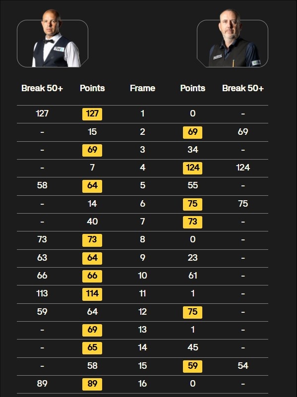 第一阶段过后双方4-4战平,第二阶段巴里·霍金斯连续打出50+取得领先并扩大优势。