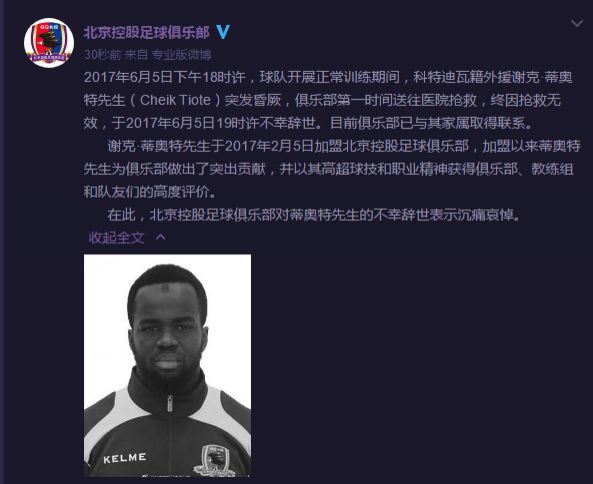 北京时间6月5日晚,中国足坛传来一个不幸的消息。北京北控俱乐部官方证实,球队外援蒂奥特在训练中出现突发昏厥情况,经抢救无效去世。