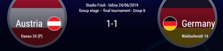 第76分钟,德国队获得前场左侧位置不错的任意球,阿米里主罚兜射近角,球擦立柱稍偏出。第80分钟,达胡德直传身后球,厄兹图纳利拼速度过掉对手,右路带球推进到禁区外,扣过防守球员直接抽射近角,球被门将扑出。第84分钟,奥地利右路挑传禁区左侧,霍瓦特停球再横传,鲍姆加特尔门前把球解围。第89分钟,奥地利继续挑传身后球,洪萨克跟进边路传中,没有什么威胁。补时阶段,达胡德闪开角度低射被门将扑出,瓦尔德施密特想补射空门也没成功。第94分钟,奥地利右路传中,洪萨克打门还是被努贝尔摘下。