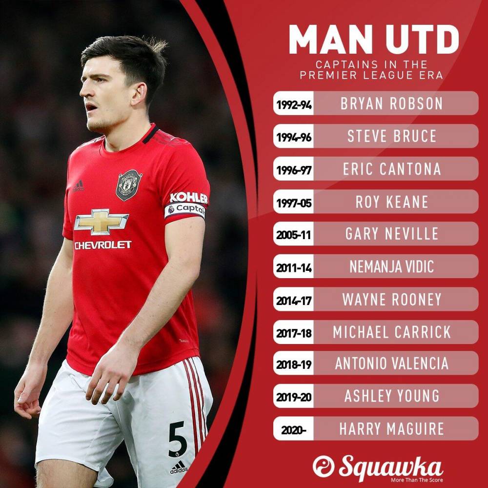 直播吧1月17日讯 今天曼联主帅索尔斯克亚确认马奎尔将会接替阿什利扬成为俱乐部的新任队长,媒体Squawka也盘点了英超时期历任曼联队长。