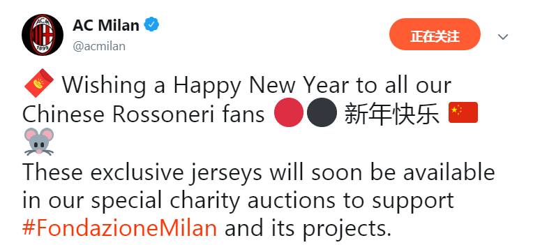 >新年祝福!AC米兰官方晒中文球衣照
