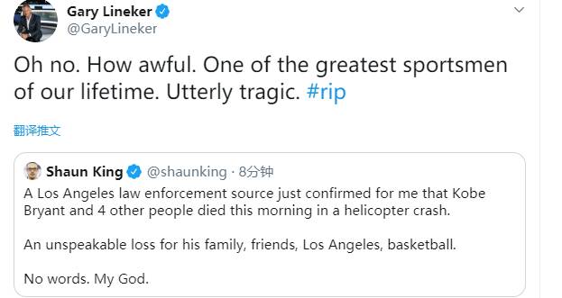 记者Shaun King发推称,洛杉矶当地部门向他证实,科比和其他4人在今天的直升机坠机事故中去世。莱因克尔转推道:太糟糕了。他是我们生命中最伟大的体育人之一。完全是悲剧。