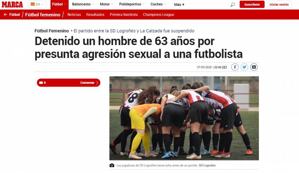 据西班牙埃菲通讯社(EFE)证实,这位年约20岁遭受性侵的洛格罗涅斯女足俱乐部队员,在比赛场地时哭着告诉队友事情发生的经过。当时球队主帅已经要求队员前往距比赛场地100米的警察局报案,俱乐部方面也告知对手和裁判实情,要求推迟比赛以解决这一恶劣事件。