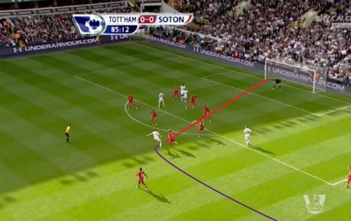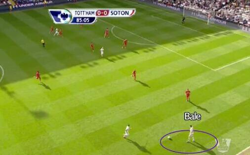 1-0战胜南安普顿的比赛,贝尔打进了全场唯一进球,这粒进球充分说明了博阿斯给予威尔士人的自由度。在一次进攻中,贝尔来到右边锋位置接球: