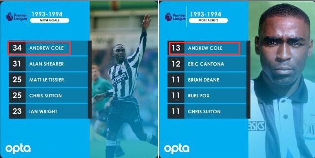 更为关键的是,金靴得主安迪-科尔在本赛季还贡献了13次助攻,成为英超历史上第一个在单赛季拿到金靴与助攻王的球员。