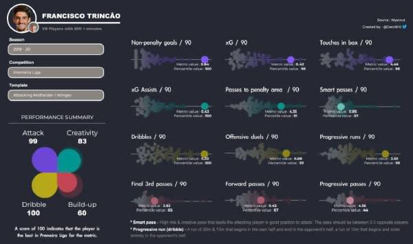 从一项数据机构对于特林康的打分中,我们可以看到他的技术特点。这份数据评价体系主要来自于4个方面:进攻、创造力、盘带和策划。特林康在进攻方面拿到99分、盘带拿到100分,相对偏低的是策划只有60分。在创造力方面,拿到了83分。从右侧的分类项可以看到,特林康在射门、助攻、盘带、进攻对抗和无球移动方面都得到了极高的分数(100分和99分)。相对偏差的是倒数第三传(65分),以及稳定过度的传球(44分)。