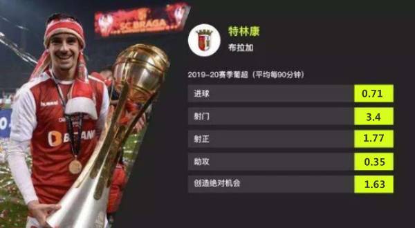 特林康本赛季是一步一步从布拉加的替补逐渐成为主要轮换,甚至是球队先发。如果将数据转换为每90分钟,0.71次进球和0.35次助攻的成绩,意味着特林康的效率是相当喜人的。除此之外,特林康的射正率超过5成,每90分钟制造1.63次绝对得分机会同样让人欣喜。