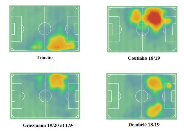 从热图对比中可以看到,特林康的活动区域跟格列兹曼更为相似。他们都是喜欢回撤接应中场,带动整体推进,随即穿插核心区域的跑动型攻击手。相比于登贝莱多一份中场属性,相比于库蒂尼奥拥有更强的冲击禁区能力(毕竟身高腿长优势在)。