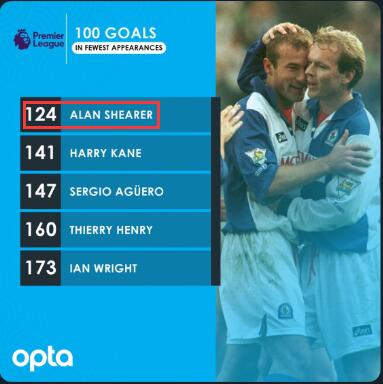 图7:希勒只用了124场比赛就攻入100个英超进球