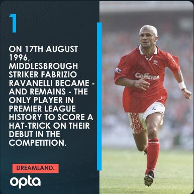 图6:拉瓦内利是英超历史上唯一一个,首秀上演帽子戏法的球员
