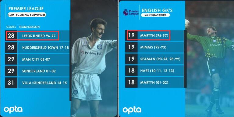 按照道理来说,这是一支标准降级球队的进攻力,但是利兹联却在这个赛季位居联赛第11位,创造了一个小记录。而这一切,与他们不错的防守息息相关:本赛季他们一共丢了38球,仅仅比阿森纳、利物浦少。而他们的门将马丁,则完成了19次零封,与大卫-希曼、Mimms一起成为在英超赛场上完成零封场次最多的英格兰门将。