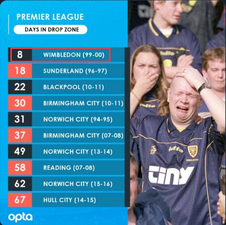 与温布尔登相比,另外一支老牌球队谢周三的降级就没有太大的“意外”。因为,本赛季他们一共在降级区待了278天,创造了英超历史上所有降级球队之最。