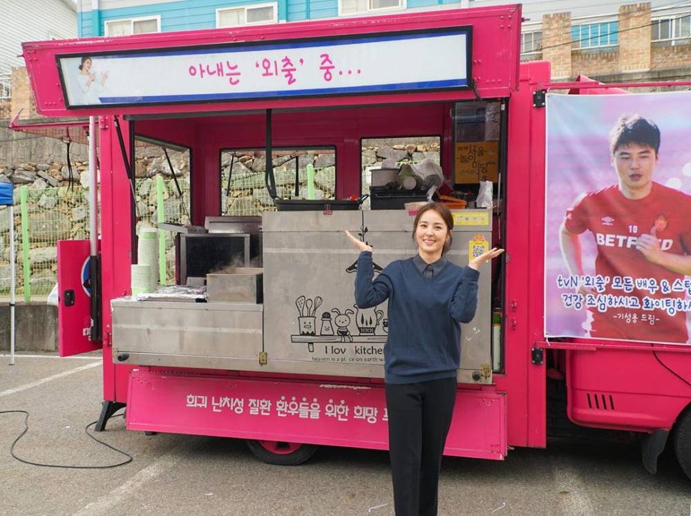 韩惠珍复出后正在拍摄TVN独幕剧《外出》,远在西班牙的奇诚庸送来咖啡车为妻子应援。韩惠珍在咖啡车前留下纪念照,她十分感动地表示,自己对奇诚庸的暖心举动并不知情。