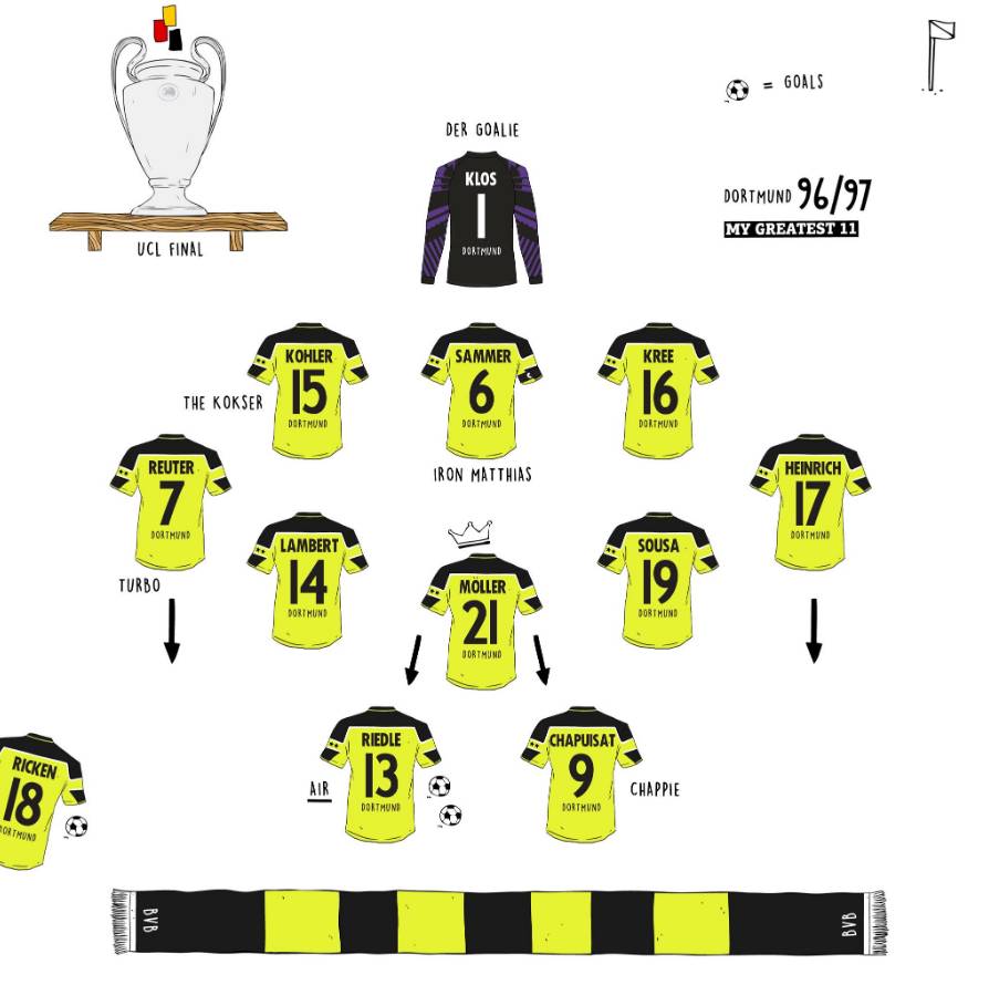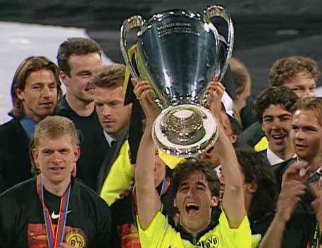 上世纪90年代的欧冠决赛总是冷门迭爆,1990/91赛季贝尔格莱德红星一黑到底,1992/93赛季马赛颇具争议地成功逆袭,1993/94赛季并不被看好的AC米兰击垮巴萨梦之队,1994/95赛季阿贾克斯青年军埋葬米兰王朝,1995/96赛季尤文图斯将巅峰贾府扼杀…..这其中,又以1996/97赛季的多特蒙德最为黑马,在一片看衰声中,大黄蜂赢得了队史迄今唯一的大耳朵杯。