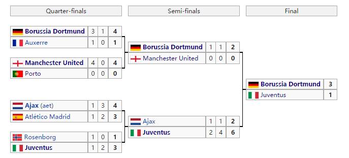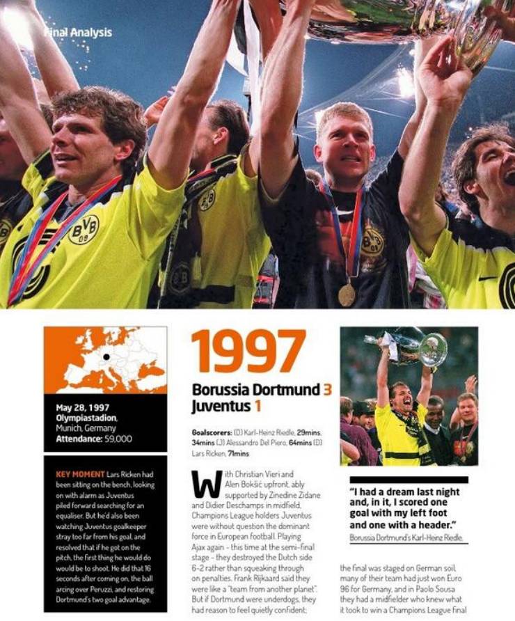 落后的尤文在下半场奋起反击,持续进行压迫性打法,皮耶罗也确实用杂耍般的脚后跟破门扳回一城,不过很快替补上场的里肯就打进了一粒惊世骇俗的吊射。最终的比分定格在3比1,多特三脚射正就转化为3个进球,他们成为了实用足球的典型代表。这是德国球队自1983年汉堡夺冠后首次君临欧洲,多特完成了一个了不起的成就!