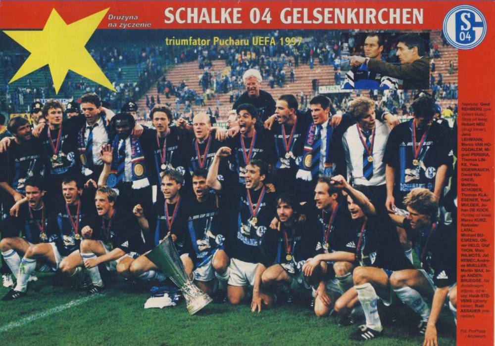 在度过了1994/95赛季的财政危机之后,沙尔克于1995/96赛季获得德甲季军,得以进军联盟杯。面对双线作战,俱乐部管理层决定在保级的前提下冲击联盟杯——事实也确实如此,那个赛季沙尔克仅仅名列德甲第12。不过,在荷兰教练史蒂文斯的率领下,皇室蓝过关斩将,以出色的防守反击创造奇迹。一路上,倒在他们脚下的有罗达JC(荷甲)、特拉布宗(土超)、布鲁日(比甲)、瓦伦西亚(西甲)和特内里费(西甲),最终在决赛里依靠点球大战击败了强大的意甲豪门国际米兰。