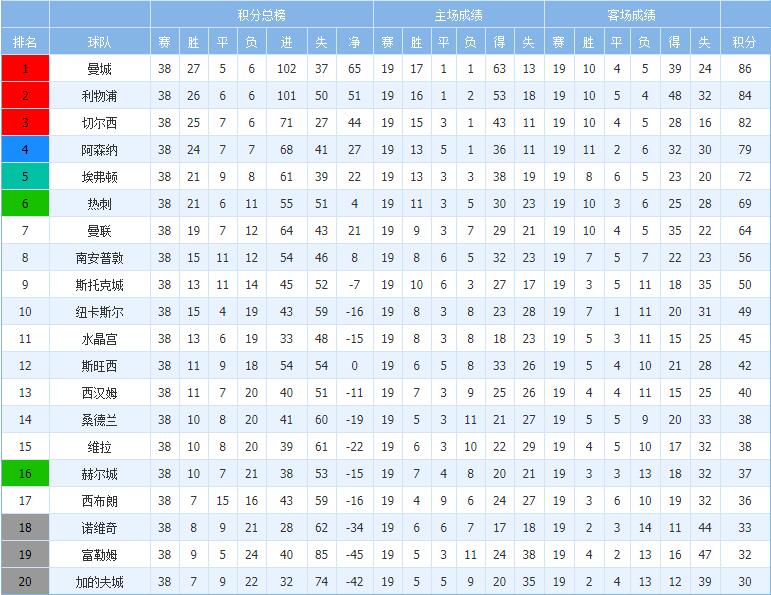 86分,曼城拿到了英超时代球队的第三个联赛冠军,罗杰斯的利物浦以2分之差位居第二,而且两支球队的联赛进球都达到了三位数,进攻火力异常恐怖。穆二期的切尔西,以82分排在联赛第三,第四依然是阿森纳,他们拿到了79分。