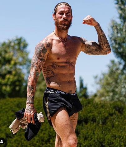 直播吧5月31日讯 皇马队长拉莫斯开启复训,昨天他在上传了一张训练结束后秀肌肉的照片。