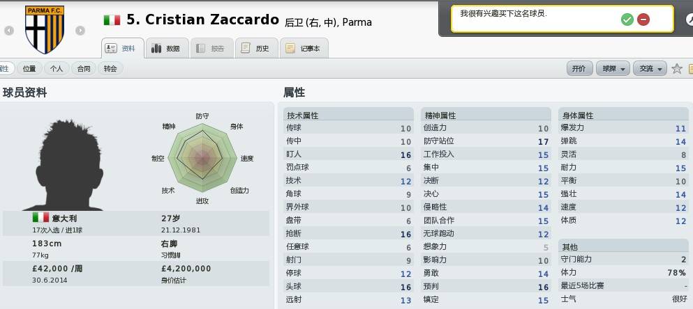 技术特点:以FM2010效力于帕尔马,27岁的扎卡尔多显示的数值来看应该是比较中肯的。身体,精神和技术三个大分区里面,涉及防守相关的评分大部分都在相当不错的14或以上。其中比较差的就是,灵活和平衡两个数值对于边后卫来说都不够看,还有非常一般的速度爆发力也注定扎卡尔多只能算作一个蹲坑型的右边后卫。