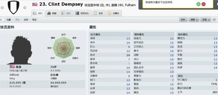 技术特点:跑位灵动且积极,作为前场多面手,具备足够优秀的技术能力,从FM2010的数据图看,关键传控属性都能达到14的基准值,对于中游球队而言已经是良配。加上工作投入,集中,决心等精神属性没有明显短板,至少不会成为那种独狼式的球员,这对于战术布置和球队配合都非常有用。