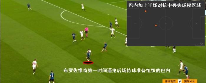 限制了巴内加就限制了塞维利亚守转攻的核心发起点。不过,国米的限制没有延续性:在整个下半场比赛中,巴内加在第88分钟才在持球的情况下第3次丢失了球权。而且,在上半场比赛由于对巴内加的主动限制带来了同样较多的隐患。