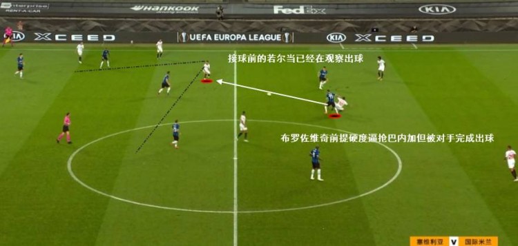 巴内加具备较强的持球与对抗能力,而且,塞维利亚这支球队在找寻空位以及快速出球上也十分精通。从上图可以看到,面对布罗佐维奇的逼抢,巴内加在艰难局面下完成了分球,而接球的若尔当已经提前开始观察队友的位置准备分球。这时候,国米的防线就会出现隐患。