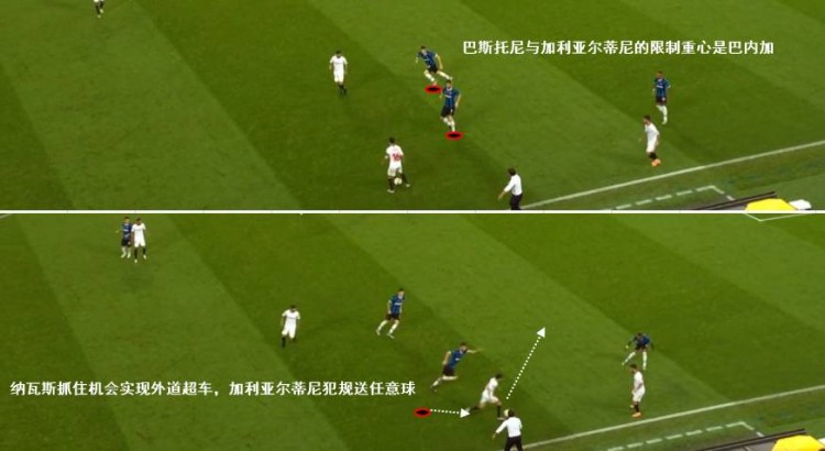 国米球员本场比赛对巴内加的限制整体上并不算好,但是,球员在战术执行力上却值得肯定。上图中,纳瓦斯持球是巴斯托尼与加利亚尔蒂尼的肢体倾向以及十分明显。不过,纳瓦斯足够聪明抓住机会进行了外线超车制造了加利亚尔蒂尼的犯规,然后,任意球战术攻入第3球。