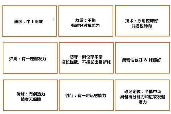 从九宫格技术点评可以看到,麦肯尼的身体素质不错,柔韧性和球感好是优势。他作为一名中场有着不错的跑动能力和传球创造力。