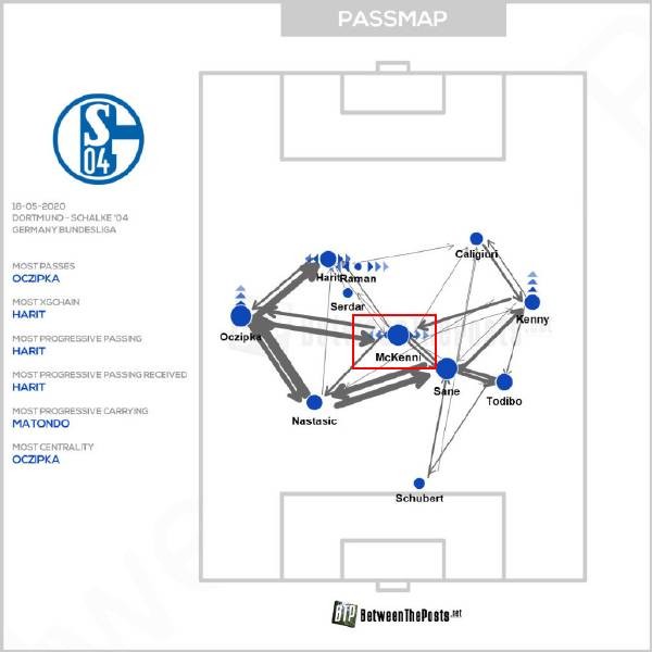 从沙尔克04的统计数据可以看到,球队的进攻中三名球员很重要,一个是边锋马通多、一个是左后卫奥奇普卡,另外一个是准前腰的阿里特。不过同时也需要看到,麦肯尼在中场的拿球比例很高,他主要起到推进加速带出节奏,以及具备向核心区域发起攻击的创造力。