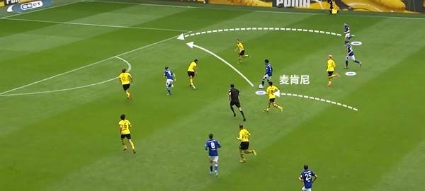 再来看看这一次的攻防转换,中卫托迪博成功断球后送出准确的直塞球,麦肯尼拿球后加速推进。他跟奥亚尔一样,有一定的带球能力,但是问题在于麦肯尼带球中的传球时机选择和传球精度与奥亚尔差距不小。这一次自己带球太多,没及时分球边路的马通多,结果遭遇对手破坏。