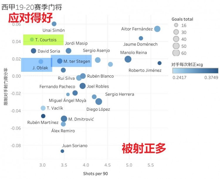 这是五大联赛所有球队19-20赛季被对手射门情况。横轴为累积的放给对手的预期进球数(xg而非xcg),纵轴为对手真实射门得分率(注意不是自身的限制对手射门得分率),圆点大小为对手射门次数,颜色为实际丢球数。