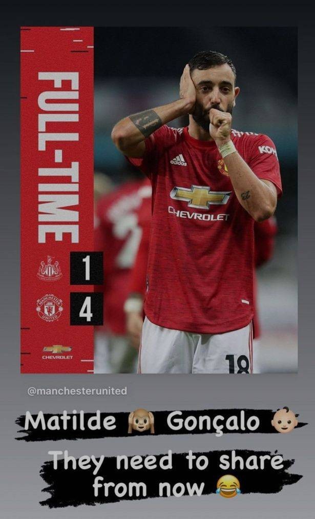 费尔南德斯在Instagram上晒出了自己庆祝的照片,并写道:“玛蒂尔德和冈萨洛(B费孩子的名字),他们从现在开始需要共享我的庆祝动作了。”