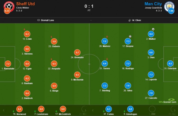 直播吧10月31日讯 在刚刚结束的一场英超第7轮比赛中,曼城凭借着沃克的进球客场1-0小胜谢菲联。在whoscored的赛后评分里,收获进球的沃克获得了8.4的赛后评分,为全场最高,而为沃克送出助攻的德布劳内,获得7.3分。
