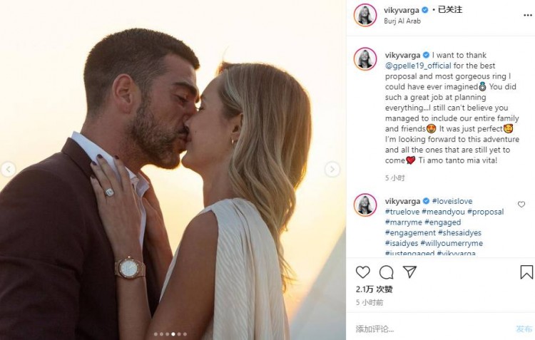瓦尔加写道:“谢谢@佩莱完美的求婚,还有我曾幻想过最华丽的戒指💍你做得一切如此出色,你请来了我们所有的家人和朋友😍简直令我难以置信。非常完美🥰 我期待这次冒险和我们未来的篇章💘我是如此爱你”。