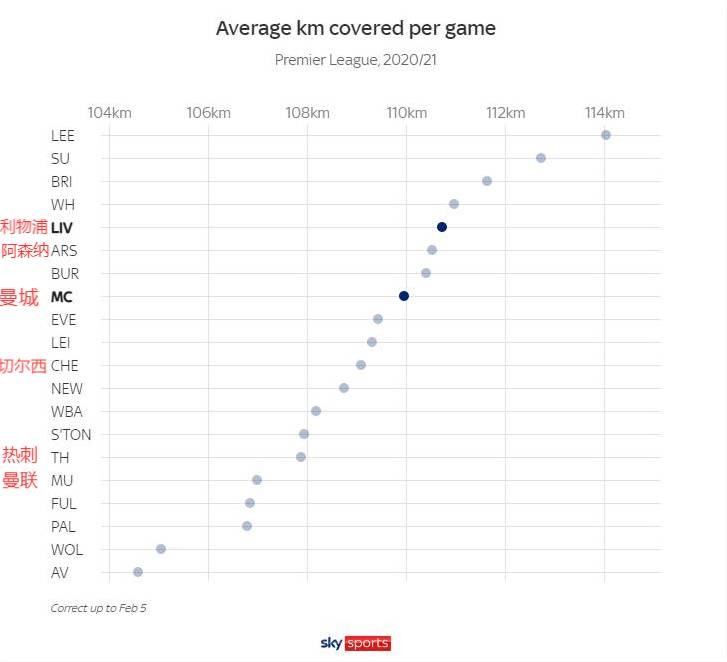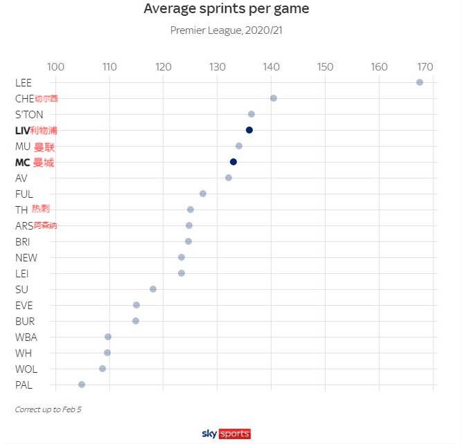直播吧2月6日讯 天空体育对本赛季至今英超各支球队的跑动数据排行进行了统计,其中全队平均每场跑动距离和冲刺次数都是利兹联居首。而传统强队方面,利物浦在这两项数据中都是处于领先地位。