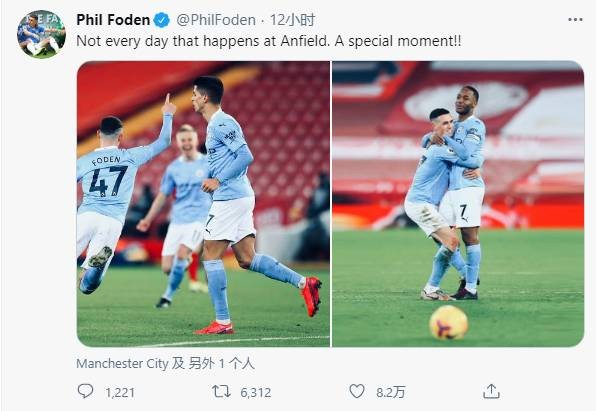 本场评分最高的福登在赛后发文表示:这样的比赛不会每天都在安菲尔德上演,这是一个特别的时刻!