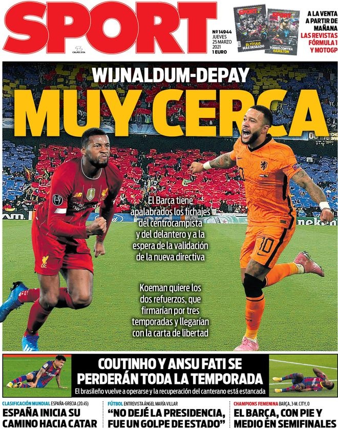 1、“维纳尔杜姆和德佩非常接近”,巴萨接近搞定维纳尔杜姆和德佩,正在等待新管理层的确定,科曼希望与两人签约3年,两人都是自由转会加盟。