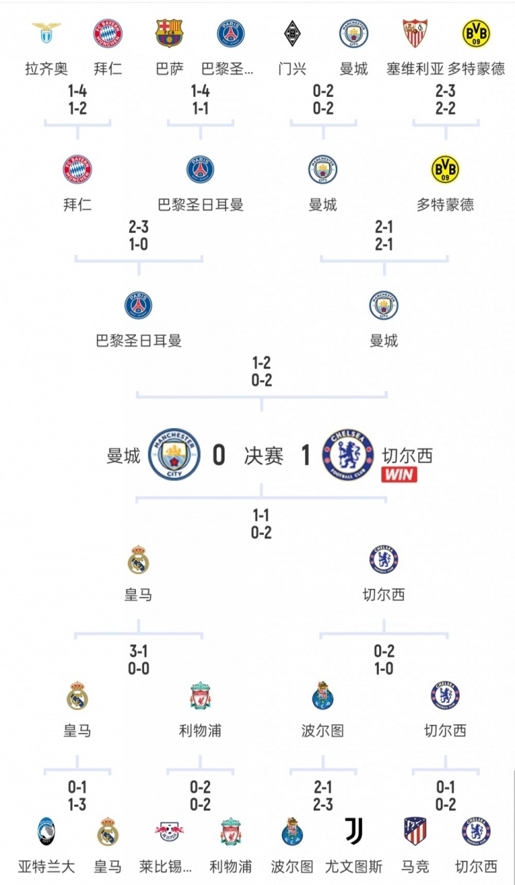 淘汰赛阶段,1/8决赛,切尔西客场1-0、主场2-0双杀马竞;1/4决赛,切尔西客场2-0波尔图,主场0-1总分2-1晋级;半决赛,切尔西客场1-1皇马,主场2-0总分3-1晋级。