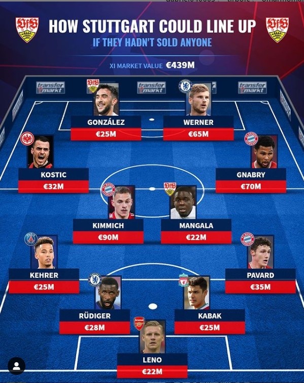 斯图加特若不卖人最佳阵(总身价4.39亿欧):