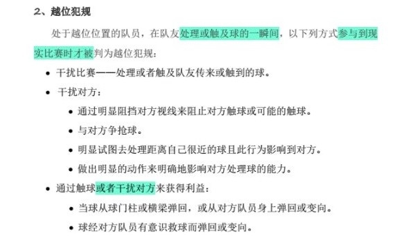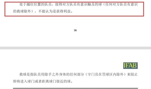 IFAB制定的规则中规定:“处于越位位置的队员,接得对方队员有意识触及的球(任何对方队员有意识的救球除外),不能认为是获得利益。”