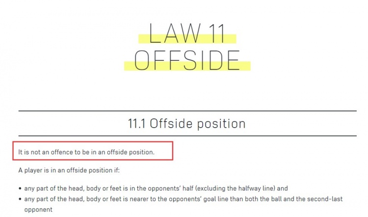 首先我们必须明确一点:处于越位位置并不犯规。负责讨论和决定修改足球规则的国际团体,IFAB(国际足联联合会理事会)在越位规则的第一条就明确指出了这一点(下图)。