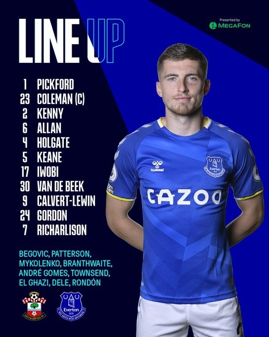 埃弗顿首发:1-皮克福德、23-科尔曼、2-肯尼、6-阿兰、4-霍尔盖特、5-迈克尔-基恩、17-伊沃比、30-范德贝克、9-勒温、24-安东尼-戈登、7-理查利森