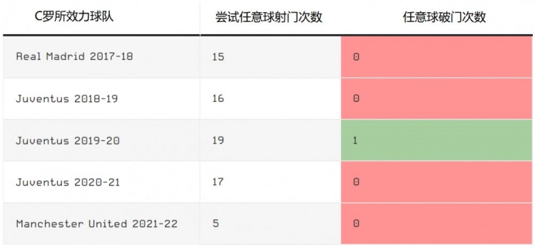 此前效力尤文图斯三年时间,C罗在各项赛事中尝试了69次任意球射门,但唯一的进球还是2019/2020赛季对阵都灵的比赛。