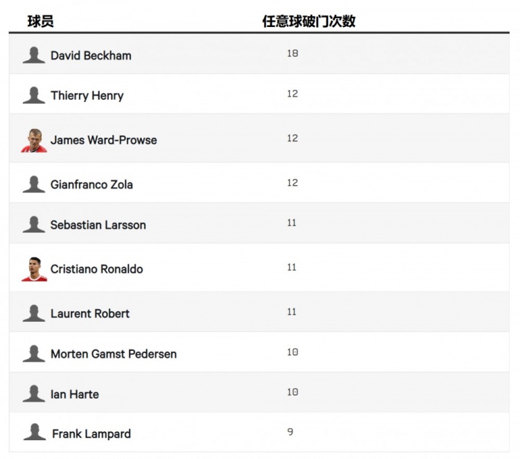 征战国家队比赛,C罗的任意球射门情况可能稍好一些,但上一次破门也是2018年世界杯对阵西班牙之时——当时他用自己的成名作“电梯球”攻破了对手大门。然而,自2018年夏天之后,C罗大部分任意球不是偏门而出,就是直接打在了对方的人墙上。或许大多数支持C罗继续主罚任意球的人,更多是基于这位葡萄牙巨星历史表现的信任,而不是他近期主罚任意球的状态。毕竟从历史数据角度而言,C罗在英超历史任意球破门榜单中,还排在第五位。