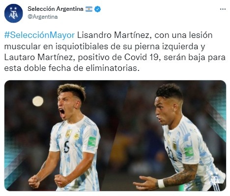 官方公告中表示,本期阿根廷国家队球员利桑德罗-马丁内斯左腿腿筋受伤,另外劳塔罗-马丁内斯的新冠检测呈阳性。
