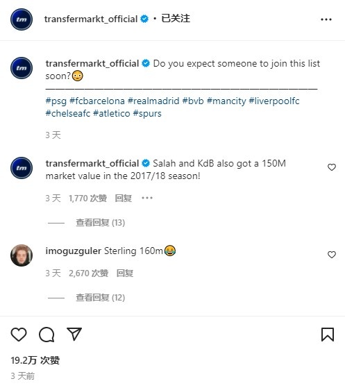 毫无悬念,热评第一就是“斯特林160m[笑哭]”。后面还有,“斯特林[笑哭]”“斯特林[哭哭哭哭]”“斯特林第四[笑哭]”“转会市场你在开玩笑[笑哭]”。(友情提示:除斯特林外评论最多的是问C罗在那里,C罗的身价峰值为1.2亿欧。)