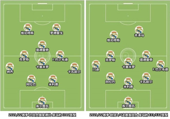 从“齐二期”连续两季被英超球队淘汰中吸取教训,安切洛蒂深知要想丰富自身的武备库,皇马必须要在压迫式打法方面完成“补课”。以主场大胜皇家社会一役(2022.03.06)为标志,皇马开始尝试与潮流接轨,F-巴尔韦德、卡马文加和罗德里戈肩负重任。从实战效果上来看,皇马只有“压迫三人组”合体时才能打出不错的高位逼抢,“新老结合”的阵容在压迫方面效果一般。安切洛蒂不得不采取了交替使用442(吸收压力)和433(挂挡提速)阵型的策略,规避己方在跑动和对抗方面的短板,突出经验和技术方面的优势。F-巴尔韦德像当年的贝尔(2016/17)一样变身边路B2B,皇马在442切换433的过程中获得了防守层次感和传控统治力。
